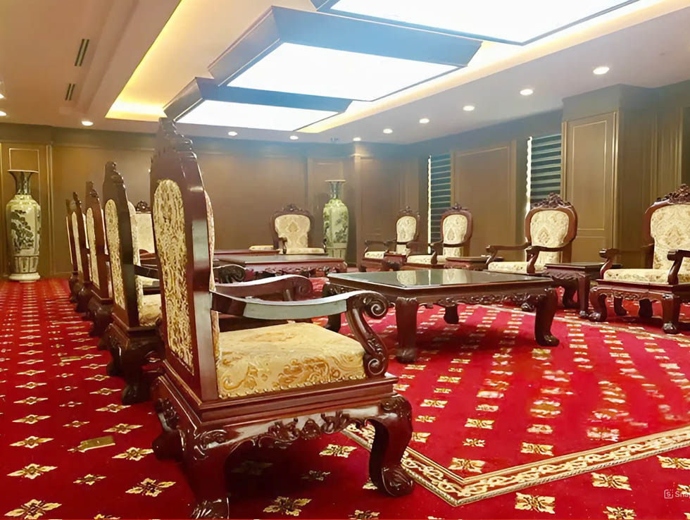 Thiết kế tân cổ điển không quá phô trương mà vẫn thể hiện sự đẳng cấp. Những chiếc ghế này được đặt trong phòng khánh tiết không chỉ mang lại sự sang trọng mà còn đảm bảo tính trang nghiêm, phù hợp với không gian quan trọng và yêu cầu của lãnh đạo cấp cao.