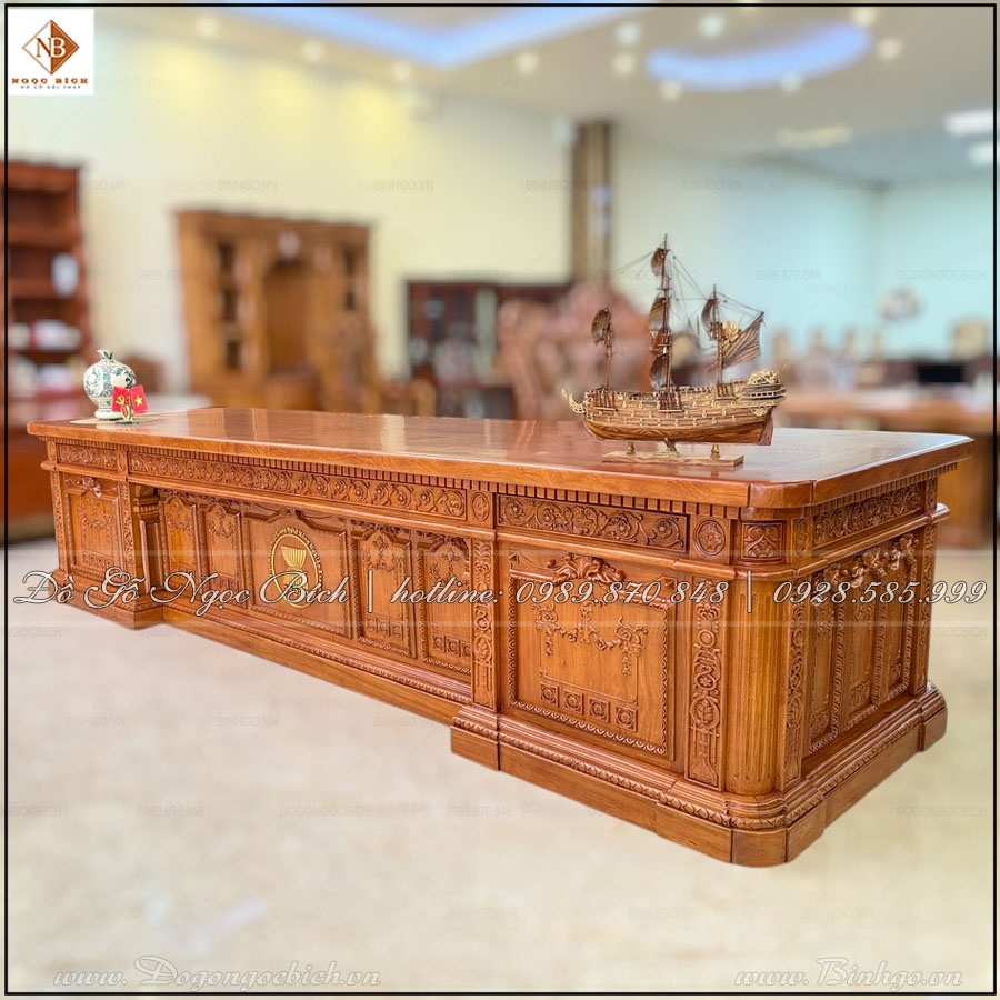 Sự khéo léo trong từng đường chạm khắc, sự chỉn chu trong từng chi tiết đã tạo nên một bàn làm việc của Chủ Tịch mẫu bàn Tổng Thống Mỹ dài 3m60 mang giá trị vượt thời gian, xứng tầm lãnh đạo.