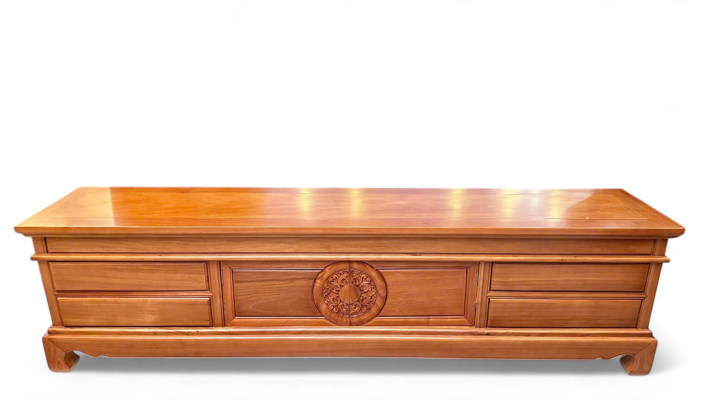 Kệ tivi gỗ gõ đỏ được thiết kế theo phong cách Á Đông, mang trong mình vẻ đẹp hài hòa giữa truyền thống và hiện đại. Phần chính giữa kệ là hộc tủ với thiết kế hai cánh mở, được chạm khắc hoa văn hoa lá tây cách điệu thành hình mặt trời – biểu tượng của sự sống, năng lượng và may mắn. Những đường nét hoa văn mềm mại, sắc sảo mang lại điểm nhấn tinh tế, khiến kệ tivi không chỉ là món đồ nội thất mà còn là một tác phẩm nghệ thuật.