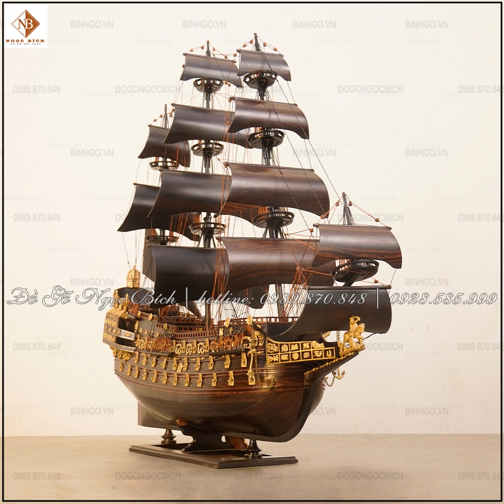 Thuyền có 3 tầng boong, 7 cột buồm căng gió, mũi thuyền vươn cao tượng trưng cho ý chí vươn ra biển lớn. Các chi tiết trang trí mạ vàng nhỏ điểm xuyết tạo nên vẻ sang trọng và quyền lực.