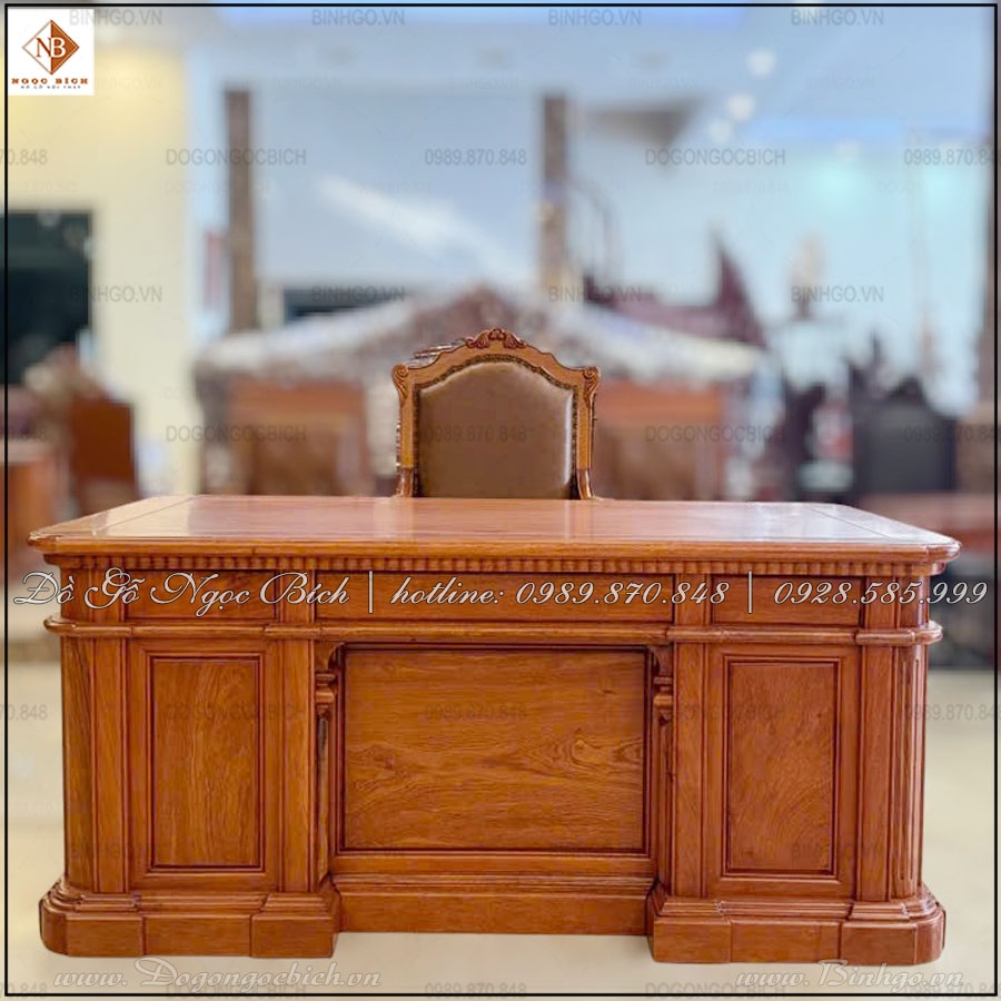 Mẫu bàn này được Đồ Gỗ Ngọc Bích chế tác từ gỗ gõ đỏ tự nhiên, giữ lại tinh thần của phong cách Mỹ cổ điển nhưng tinh giản hoạ tiết để phù hợp hơn với nhu cầu và không gian văn phòng hiện đại. Đây là dòng sản phẩm hướng đến khách hàng là giám đốc, chủ tịch, hoặc những ai yêu thích phong cách nội thất lịch lãm, bền bỉ theo thời gian.