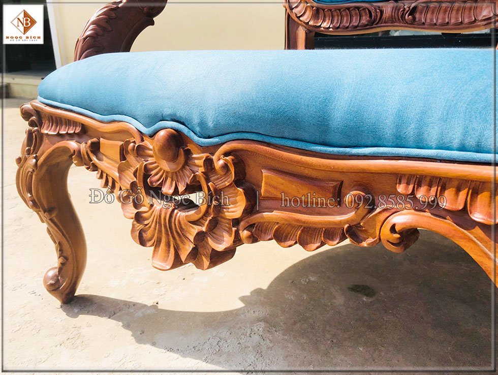 Đồ gỗ Ngọc Bích cung cấp bộ bàn trà thư giãn tân cổ điển gỗ gõ với chất liệu vải bọc cao cấp màu Deep blue. Được thiết kế với dáng ghế cao tựa lưng dễ dàng, thư giãn với 2 tay ghế cuốn cong vừa đủ tạo cảm giác thoải mái. Chiều cao từ phần mặt ngồi của ghế trong bộ bàn trà thư giãn tân cổ điển được thiết kế đúng chiều cao chuẩn giúp có dáng ngồi thoải mái nhất.